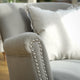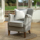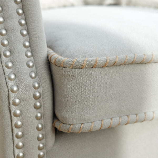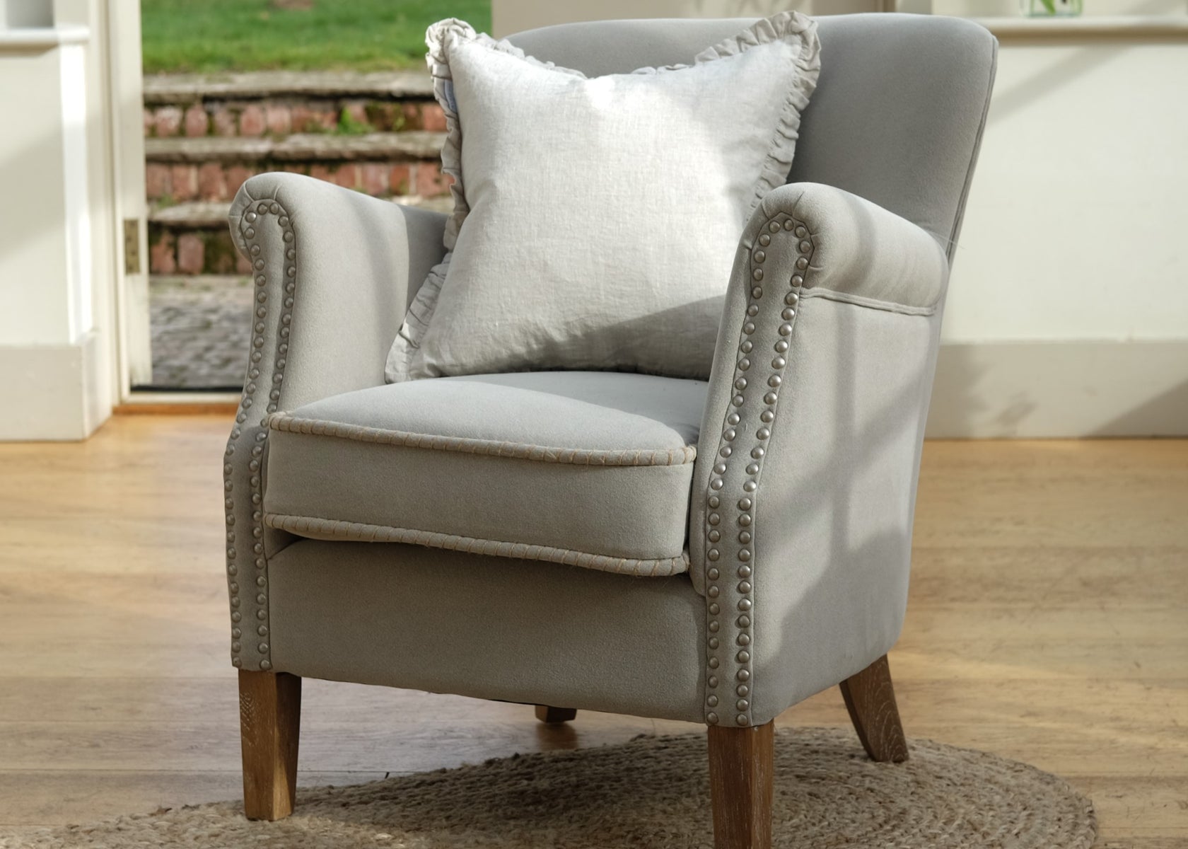 This beautiful cotton armchair is the perfect accent chair that will easily compliment an array of different interiors. In a versatile grey with elegant studs and oak legs, its classic style will complete a room.