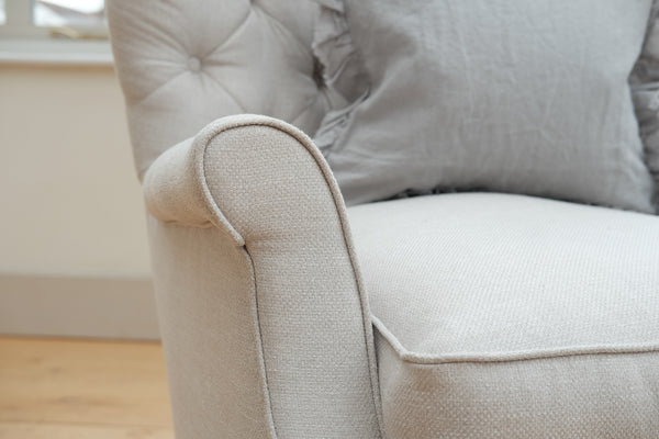 The Ralph Chair is a luxurious buttoned wing chair. Made in the UK, this chair has a hand-picked fully seasoned, hardwood frame, with all major joints, glued, screwed and staples for extra rigidity and the frame also has a 10-year guarantee. Legs are made from solid beech and available in four different wood stains: limed, light, vintage grey and medium.