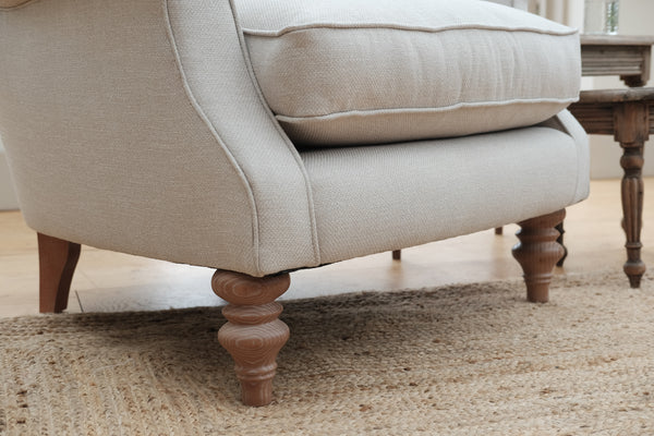 Our current display chair in the image is shown in ‘Karina- Linen’ (Grade H2 fabric) with a ‘limed’ finish on the legs but it is custom made to order in a variety of fabrics and colours.