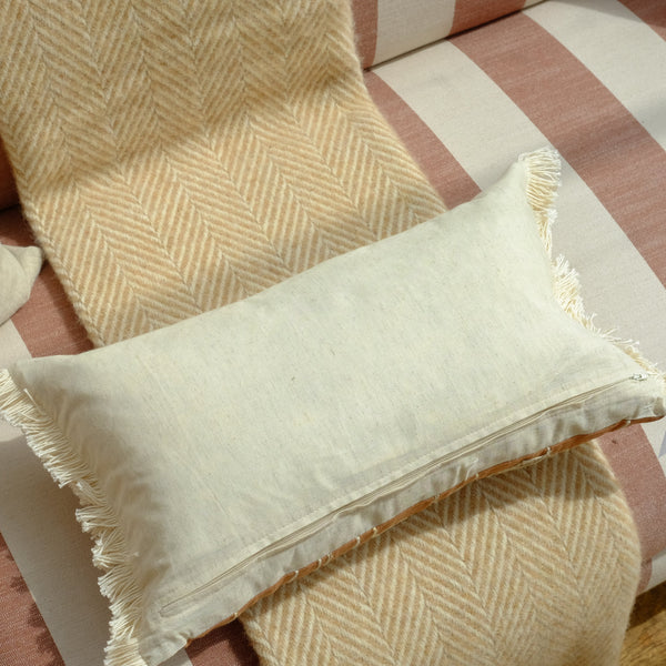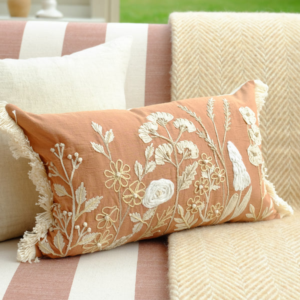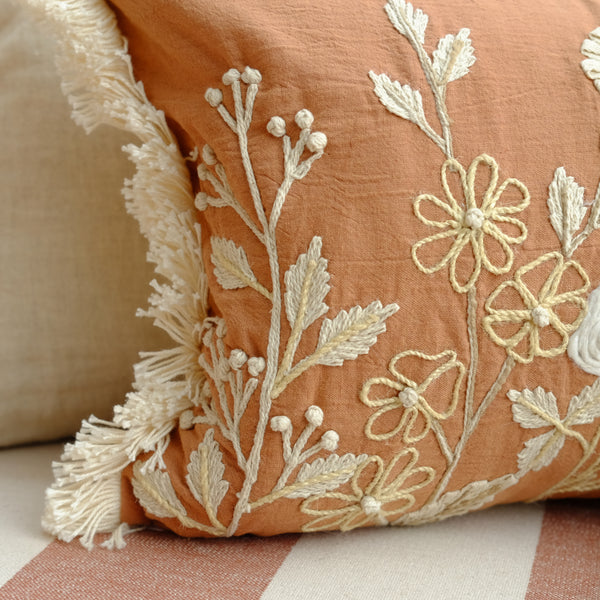 This elegant cushion has beautiful embroidered detail, which adds a subtle yet striking accent to a room. Its rectangular shape makes it perfect for layering with other cushions. The reverse of the cushion is plain cotton.