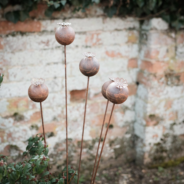 This naturally rusted poppy seed head garden stake makes the perfect decorative accessory for your flower beds as well as pairing up as an attractive plant support.