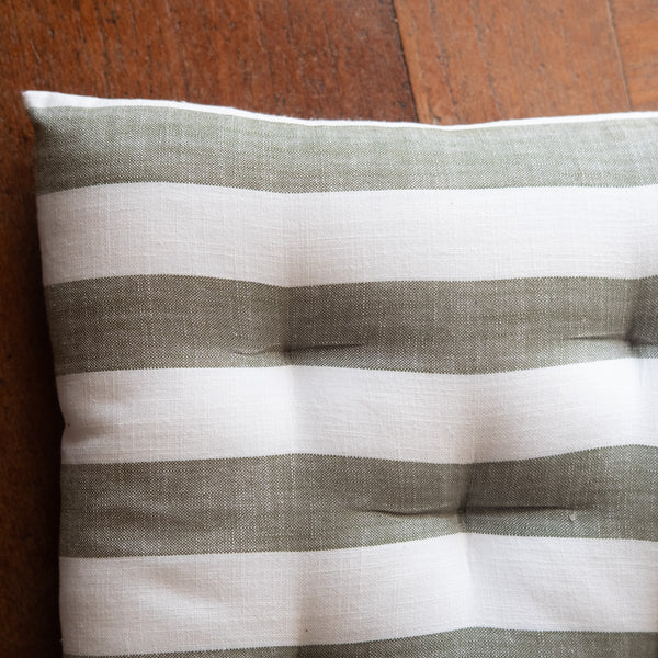 This striped olive green square seat pad is ideal for indoor and outdoor dining, adding style and comfort to any chair. The cushions feature useful ties to secure and are finished with buttons that provide support and help retain the cushion's shape.