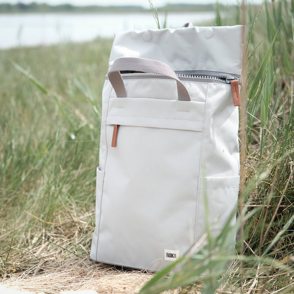 found on beaches. The production of this bag not only uses recycled materials but also uses less energy than traditional production methods. All bags are vegan friendly, made from durable, triple coated and weather resistant canvas. This bag is also available in large and medium.