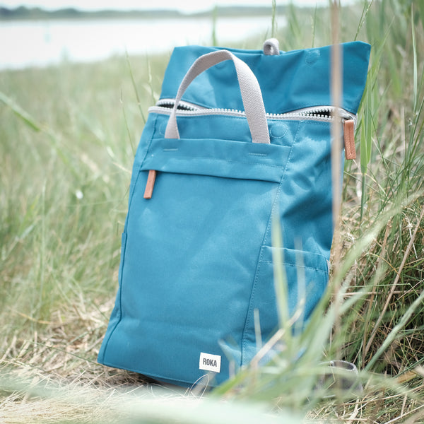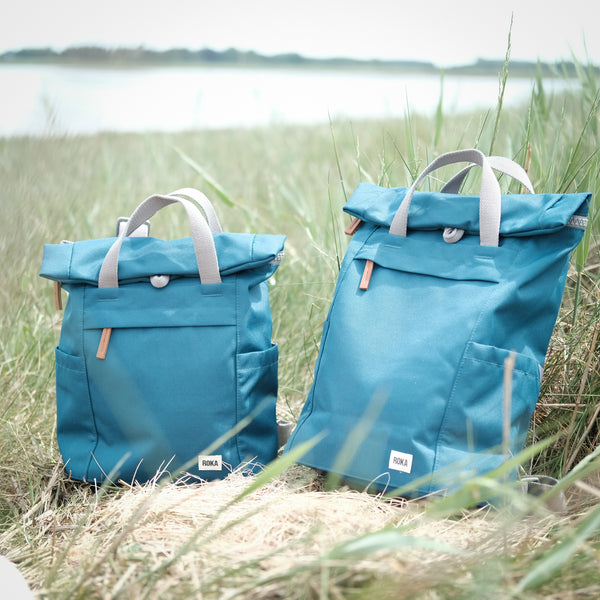 found on beaches. The production of this bag not only uses recycled materials but also uses less energy than traditional production methods. All bags are vegan friendly, made from durable, triple coated and weather resistant canvas. This bag is also available in large and medium.
