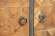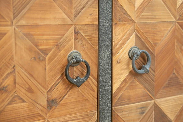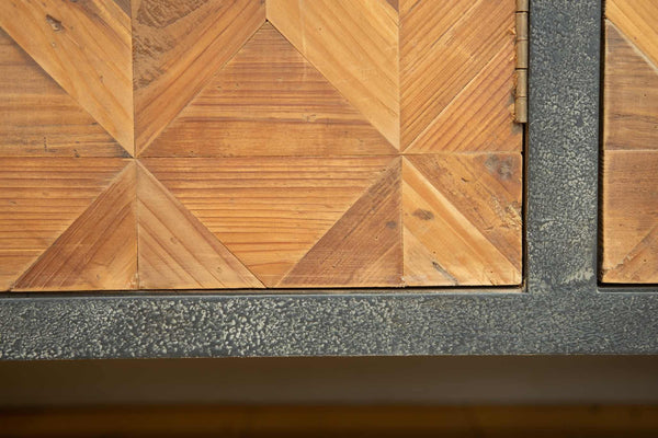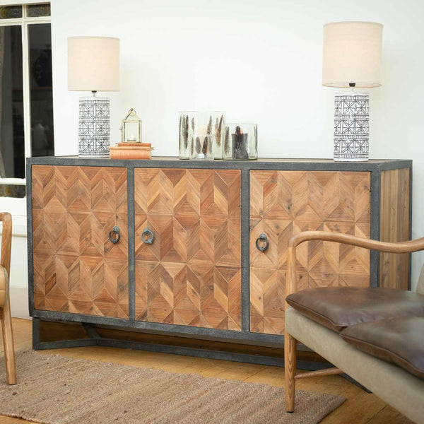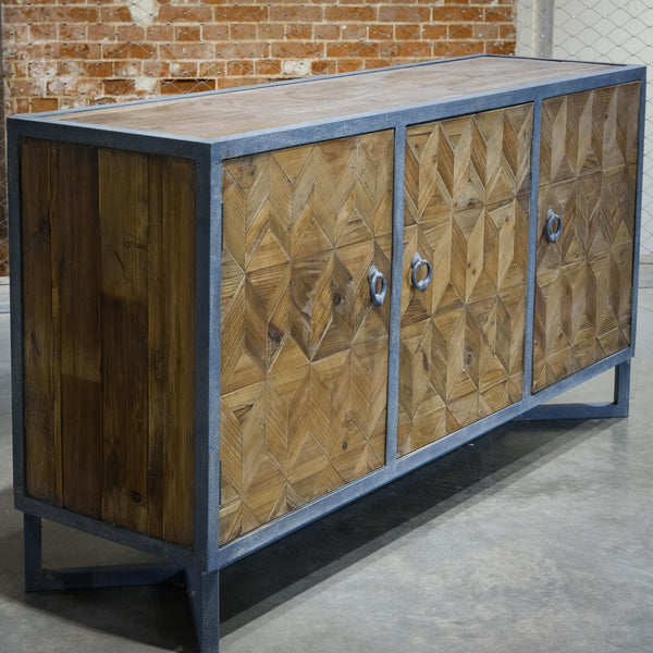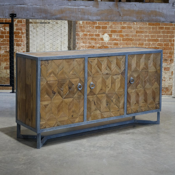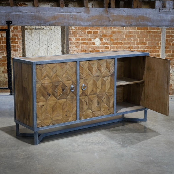 This 3 door sideboard is made from reclaimed pine; pieced together in a beautiful parquet design. It features a contrasting steel frame, and ring door handles. Furniture from reclaimed sources is also environmentally beneficial, reusing materials sustainably sourced from low-risk sources.