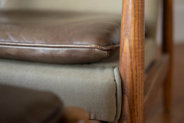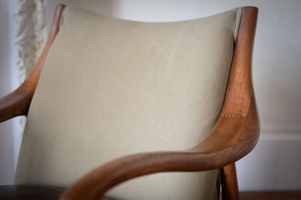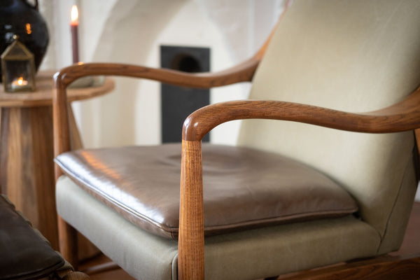 Inspired by contemporary design yet classic craftmanship, the Curlew's beautiful carved arms and harmonious mix of textures, make this collection a real triumph of design. It features a solid ash frame and is upholstered in a sage canvas with a luxurious aniline leather seat cushion. The chair is the perfect stand alone piece or add to the look with the Curlew sofa and stool.