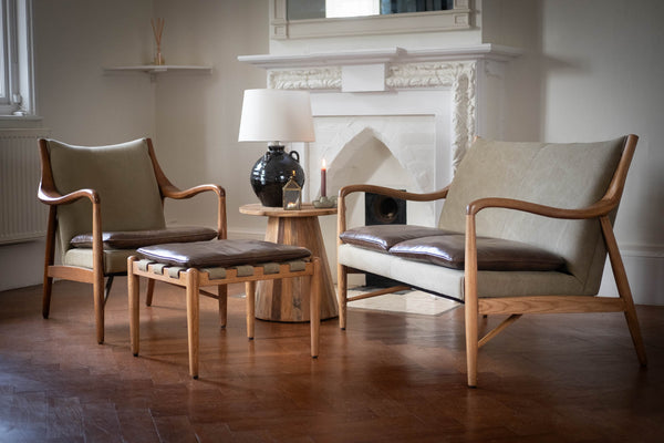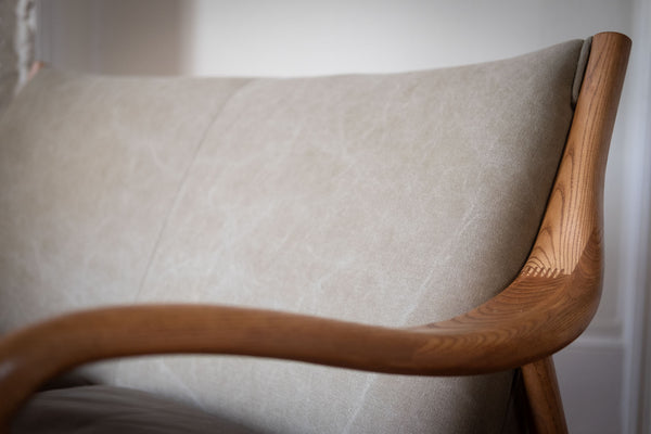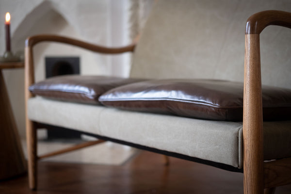 Inspired by contemporary design yet classic craftmanship, the Curlew's beautiful carved arms and harmonious mix of textures, make this collection a real triumph of design. It features a solid ash frame and is upholstered in a sage canvas with luxurious aniline leather seat cushions. The sofa is the perfect stand alone piece or add to the look with the Curlew stool and armchair.