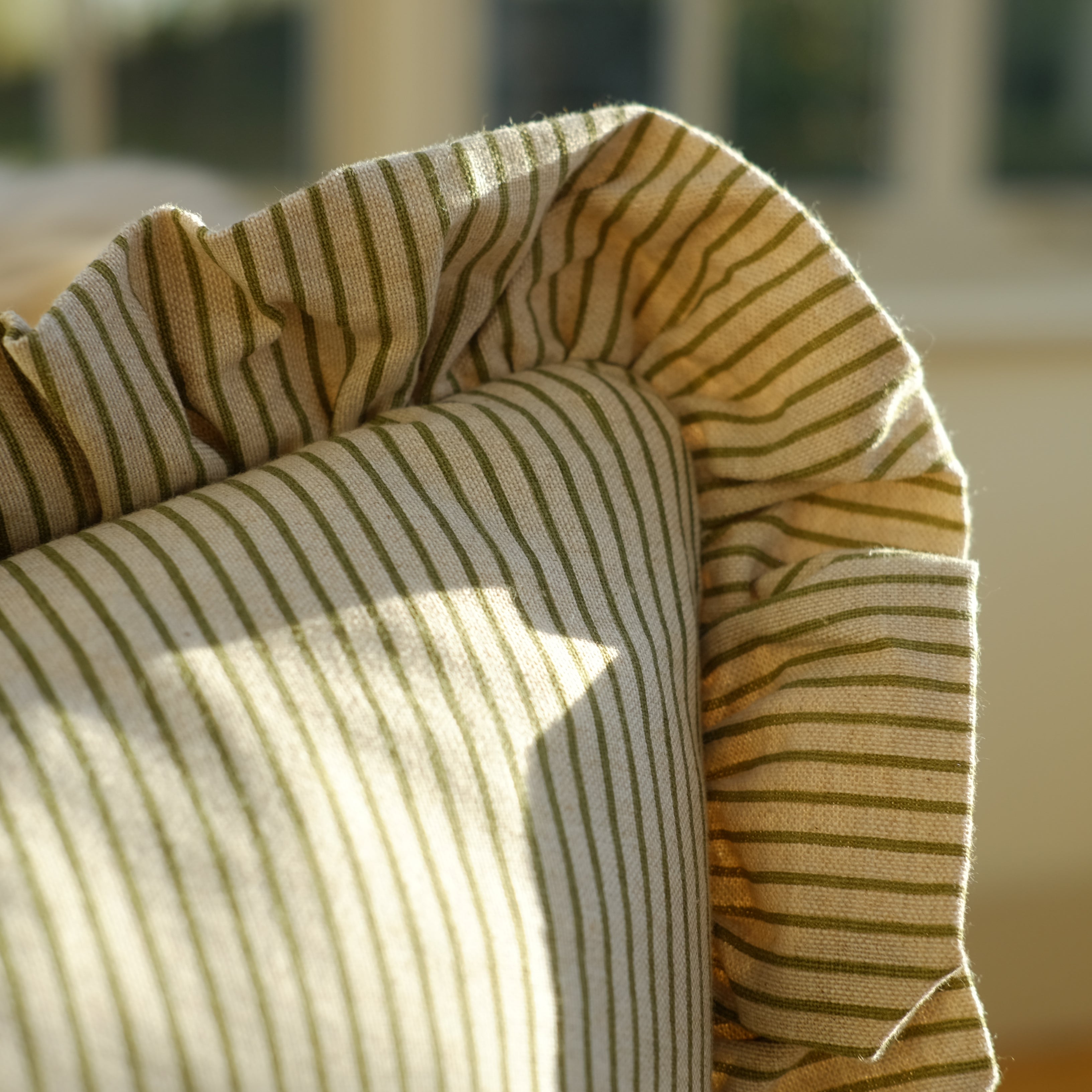 The Forest Stripe Frill Cushion is a thoughtfully designed piece featuring a beautiful ruffle edge, that brings comfort and character to your living space.