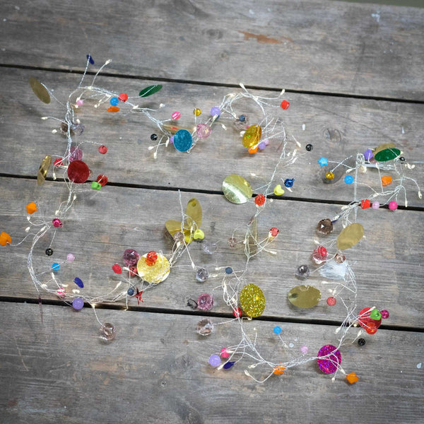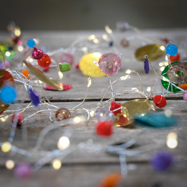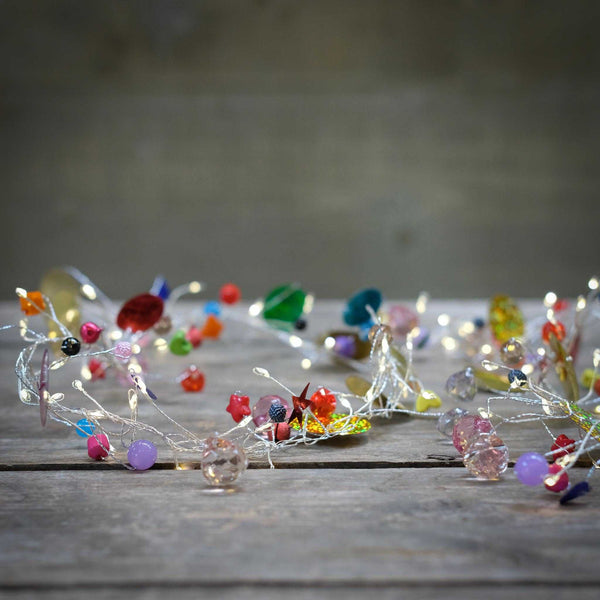 These beautiful fairy lights dazzle when the multicoloured assortment of crystals and beads are illuminated by 108 warm white LED lights.