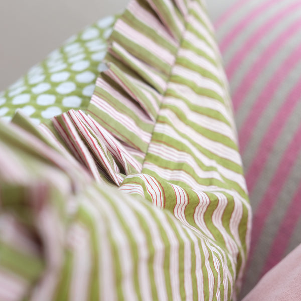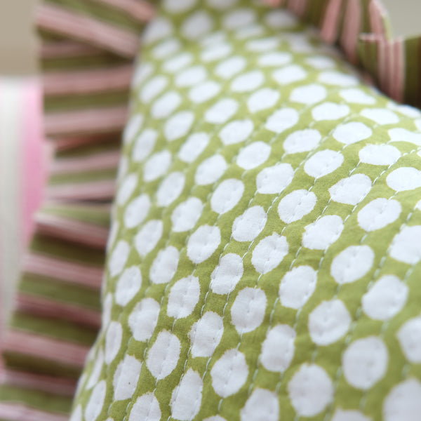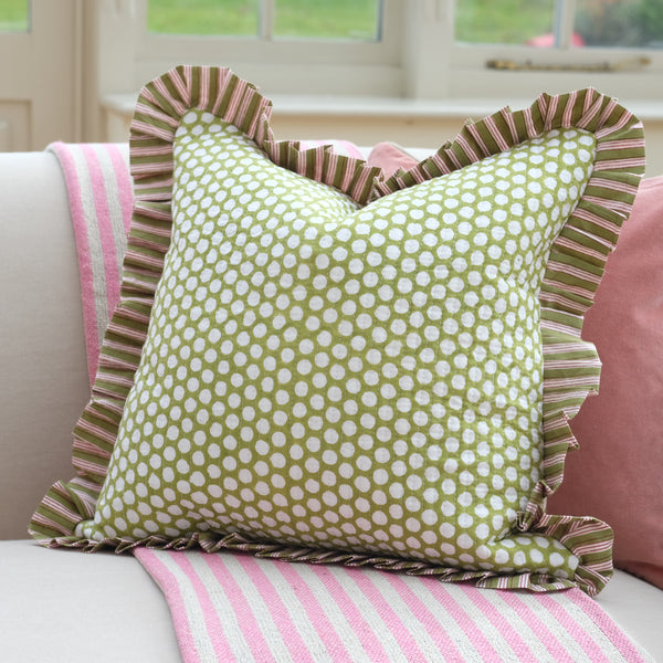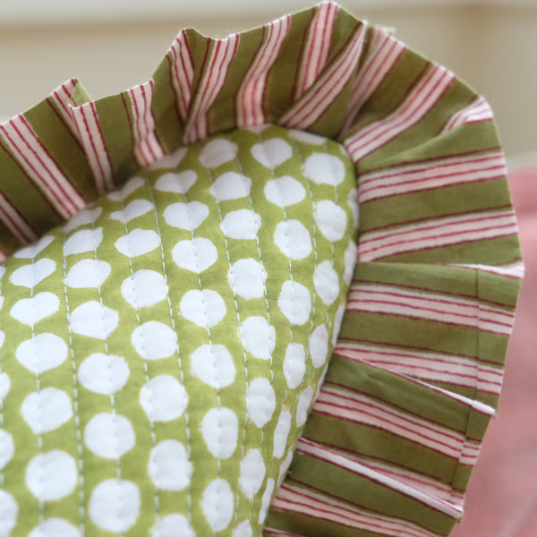 This stunning Indian block print cushion with a green polka dot design is the perfect sofa accessory, or a lovely addition to a garden room. The charming frill has a red and green stripe design, which also features on the reverse of the cushion.