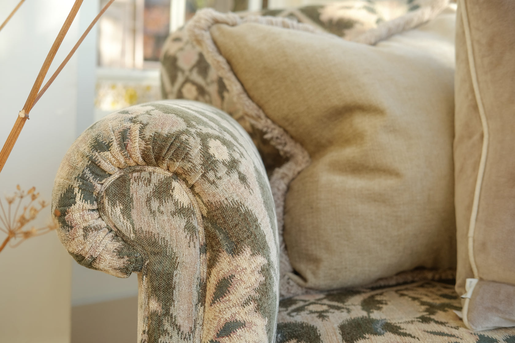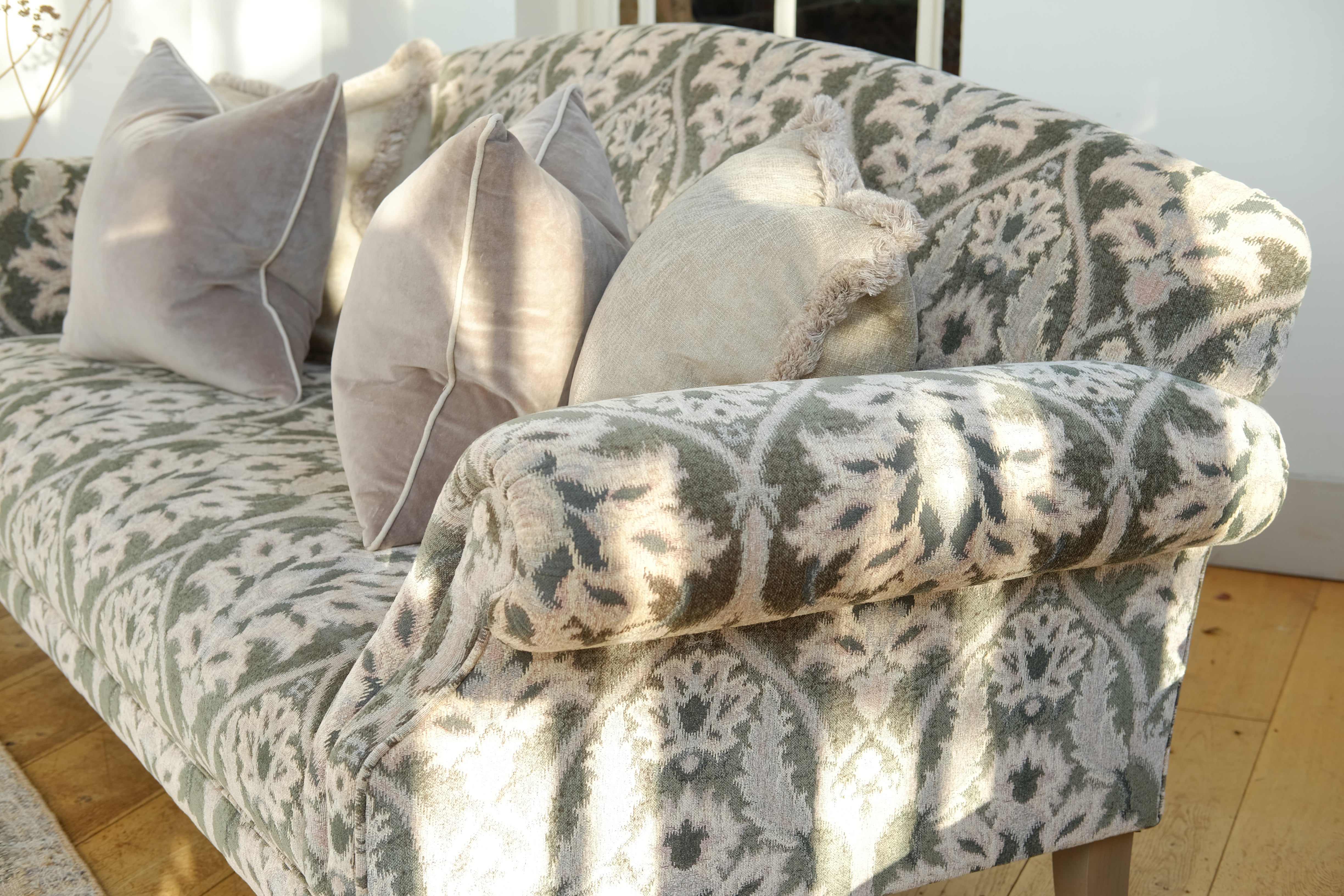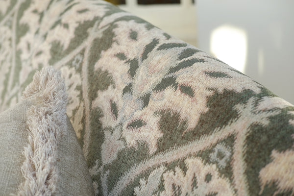 Pictured is the Martha Midi Sofa in ‘Enigma - Sage’ fabric with legs in a 'driftwood' finish. Scatter cushions in 'Biarritz Ore'.