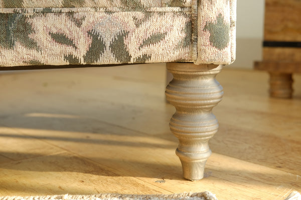 This sofa can be custom made in a variety of fabrics. The legs are hardwood and are available in natural, driftwood, dark mahogany and English chestnut.