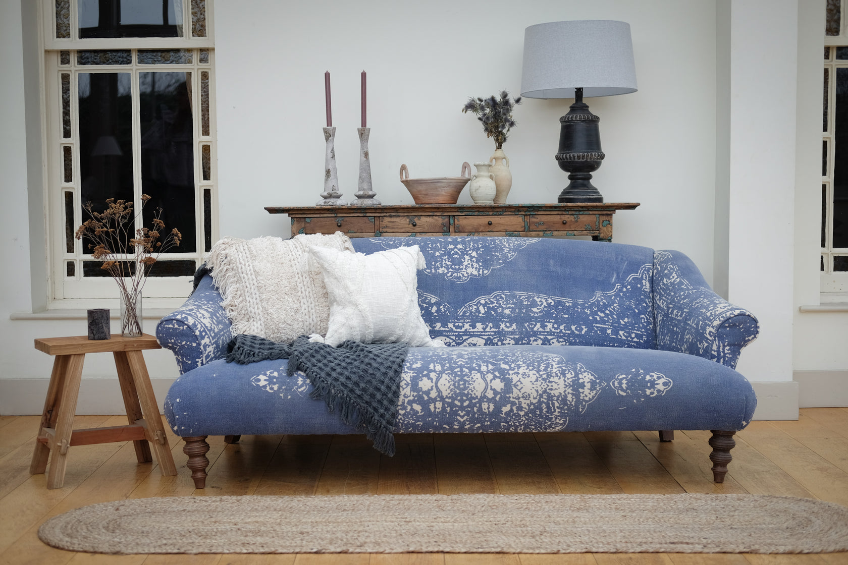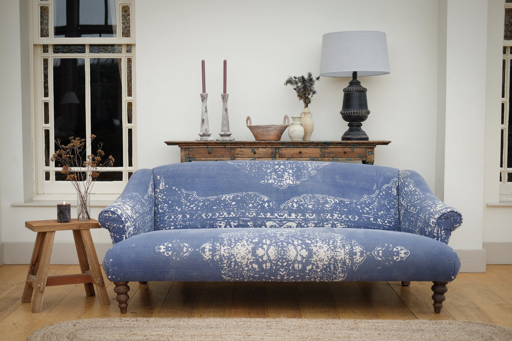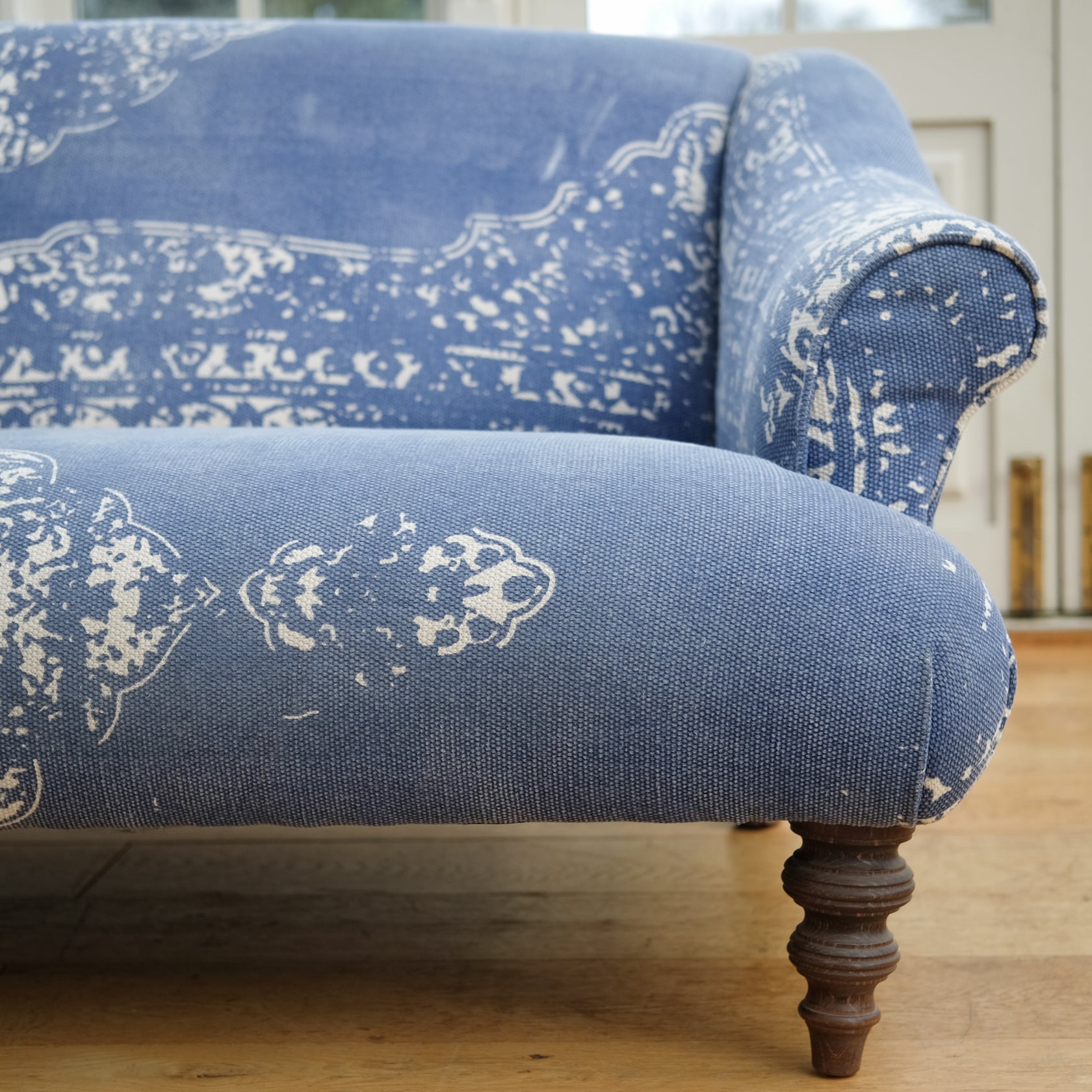 The Otto fixed seat sofa is beautifully upholstered in a heavyweight Bagru-Indigo cotton fabric; made from hand block printed rugs. The authentic charm of this handmade fabric ensures each sofa is completely unique.