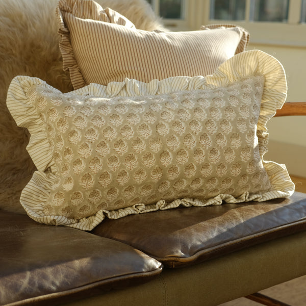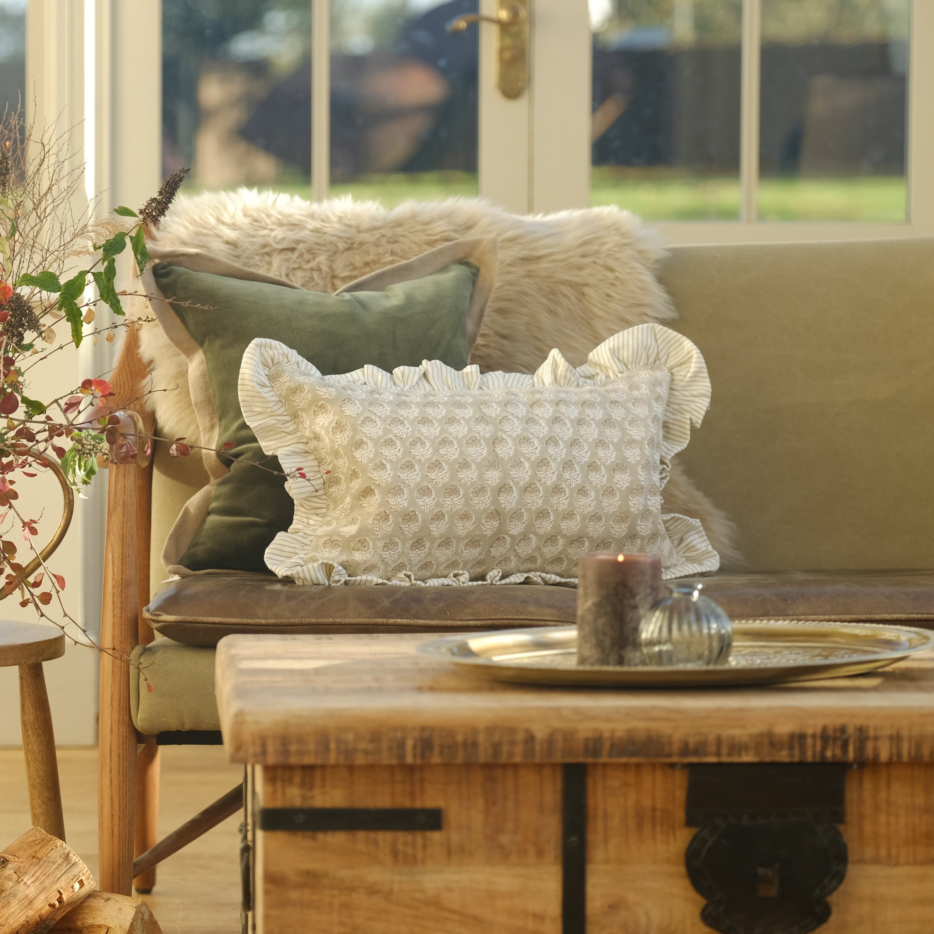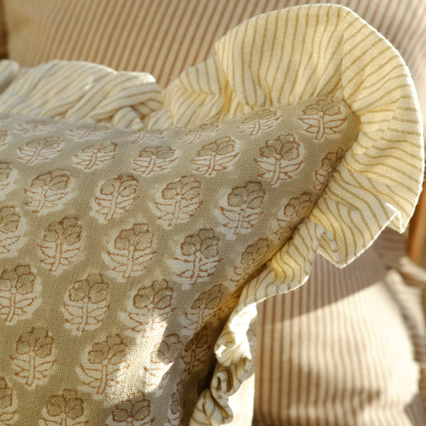 The Taupe Block Print Frill Cushion is a thoughtfully designed piece that brings comfort and character to your living space.